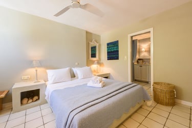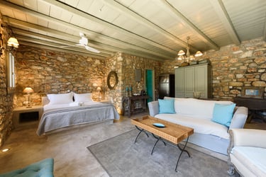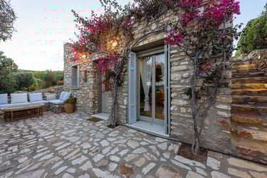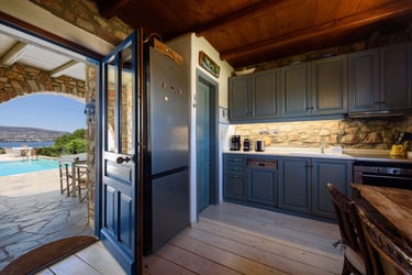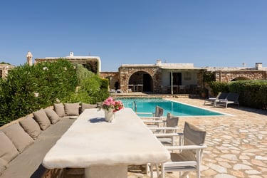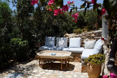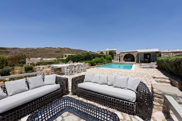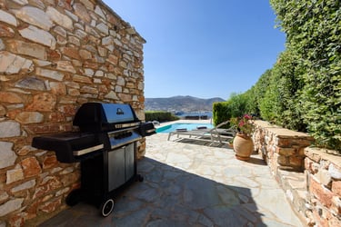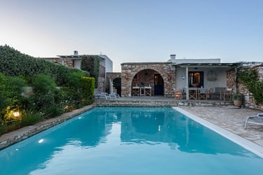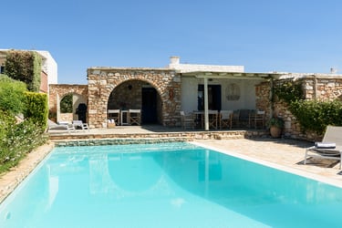 The villa is situated in a serene area of Paros, only a 3-minute drive from the magnificent sandy beach of Krios. The bustling center of Parikia, with its shops, restaurants, and nightlife, is just a short drive away.