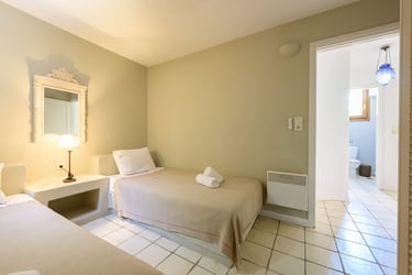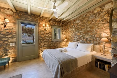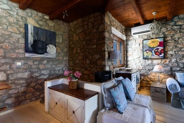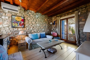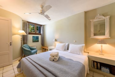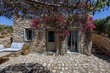 Additionally, the villa features a private pool (9x5m) surrounded by a sun-drenched terrace filled with Mediterranean plants. Below the pool area is a separate, charming guest house with its own entrance. The guest house includes a double bed, a sofa bed, a coffee machine, a fridge, a TV, air conditioning, and a private bathroom, offering a secluded space with its own terrace and spectacular views.