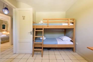 The property is built across two main levels. On the ground floor, you will find an open-plan living room and a fully equipped kitchen. This area leads to two different terraces: one designed for comfortable lounging and the other featuring a dining table for al fresco meals. The lower floor houses three bedrooms (one twin, one double, and one with bunk beds) along with two bathrooms.