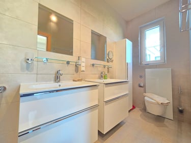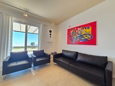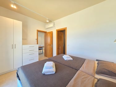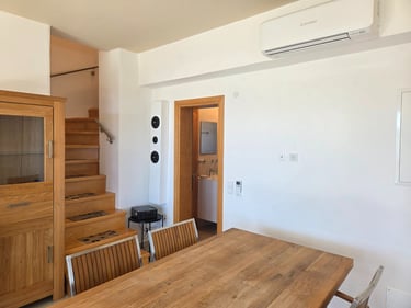 This villa offers unique privacy with its two-floor design. The ground floor features a living room, a fully equipped kitchen (with dishwasher/washing machine), a bedroom, and a full bathroom with double sinks. The top floor features the second bedroom and bathroom, along with a large, private terrace that offers stunning views of the sea and the coastal breeze.