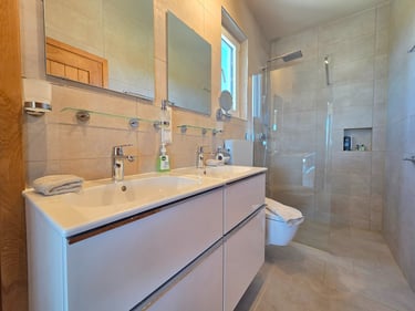 The original villa offers classic one-level comfort with a focus on expansive outdoor living. The highlight is the large private swimming pool, surrounded by sun loungers, and a dedicated BBQ and lounge area for endless summer days. Inside, you’ll find two bedrooms and two full bathrooms (each with double sinks), a dishwasher, and a washing machine.