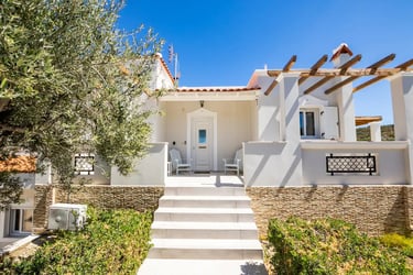 Located in the city of Pigadia, around a serene olive orchard. The Villa offers the perfect blend of relaxation and convenience. Just a short stroll from the island’s main beach and charming seaside restaurants, this stunning villa invites you to unwind while staying close to the vibrant town center, only a 25-minute walk away.