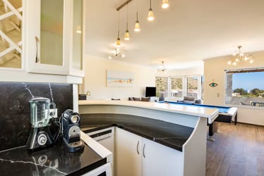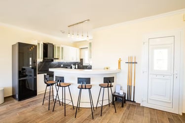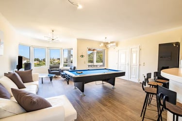 Designed for comfort and elegance, the villa features a private pool with sunbeds, a stylish outdoor lounge, and a dining area with breathtaking views. Inside, the spacious open-plan living area boasts a cozy seating space, an 8-foot pool table, and a fully equipped kitchen with a bar—ideal for both relaxation and entertainment.