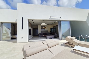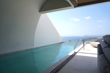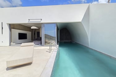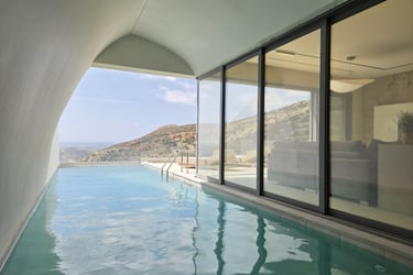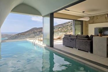Each villa accommodates up to three adults and an infant, featuring a double bedroom, a living area with a sofa bed, and a fully equipped kitchen. The full bathroom and washing machine provide convenience, while the standout indoor–outdoor pool and sun terrace invite long, relaxing days in the Karpathos sun.