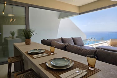 Located in a peaceful part of Puas, the villas offer uninterrupted sea views and a quiet retreat from traffic. Amoopi’s sandy beaches, tavernas, and beach bars are just 5 minutes away by car, while Karpathos town, Pigadia, is 10 minutes away, with shops, cafés, and the main harbor. Karpathos Airport is only a 10-minute drive, providing easy access while maintaining seclusion.